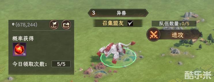 2、诸位将军可单人发起进攻,也可选择召集同盟战友共斗异兽,每个激活的异兽战场最多可进入五支队伍,参与战斗的将军都能获得一份异兽掉落的灵萃奖励,灵萃是升级队伍灵宝的主要道具。
