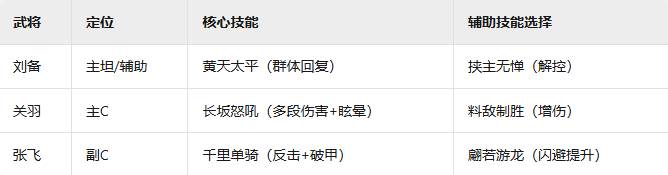刘备优先升级「黄天太平」确保续航,关羽触发被动眩晕后,张飞反击补足伤害