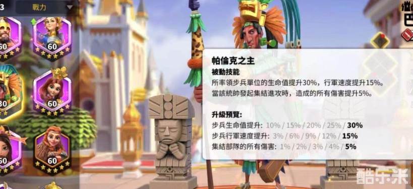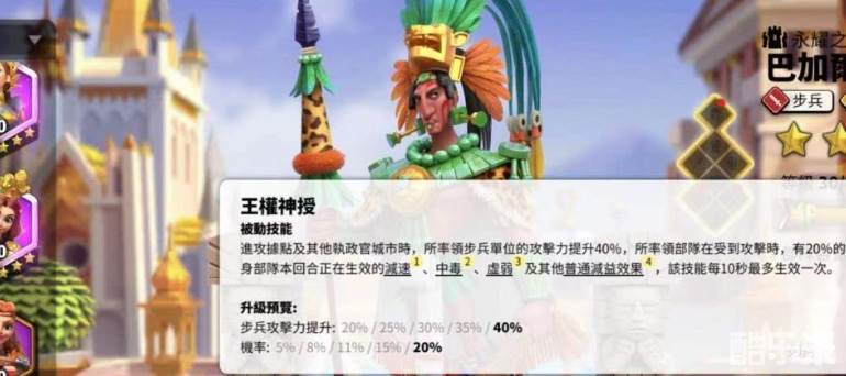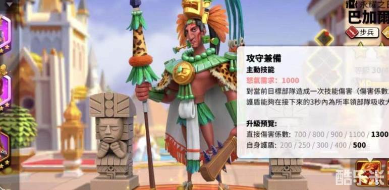 怒气技能打的伤害并不算高,护盾数值也比较一般,不过上盾机制还是令巴加尔拥有更多可搭配统帅选择。二技能帕伦克之主是让我们所率领的步兵单体,生命值直接提升百分之三十,行军速度提升百分之十五。当他发动集结进攻的时候,会让造成的所有伤害都提升百分之五。该技能主要就是增强角色的属性,包括生命值、集结伤害等,算是不过不失的加伤手段。三技能王权神授时在进攻据点或者其他执政官的城市时,我们所率领的步兵单位攻击力就提升百分之四十。