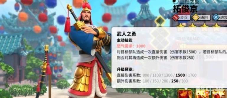 拓俊京是定位为野战与集结的步兵武将,核心技能武人之勇,会对单体目标造成系数为一千七的伤害。如果攻击对象的兵力已经低于百分之三十,就会对其额外造成一次系数为三百的伤害。相比于对野战来说,该技能可能更适合挑战驻防与集结队,毕竟只要打一段时间后,集结与驻防的兵力都会下降至百分之三十以下,这样我们打出来的每个技能伤害都是两千系数了。下面和酷乐米小编一起来看看吧