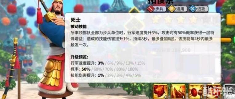 野战里挑战的怪物血量都比较高,很难将其打至到百分之三十以下,那么拓俊京造成的单体伤害就只在一千七至两千之间,在如今被大量群体伤害技能覆盖的野战战场上面根本就跟不上环境。别武班是所率领的步兵攻击力增加百分之四十,并且在步兵攻击骑兵时会增加百分之五的伤害,同时被弓兵攻击时也会多受到百分之五的伤害。算是双刃剑技能,会让兵种互相克制的加成效果变得更加明显。四技能名为死士,当率领的部队全部都是步兵时,便会让行军速度增加百分之十五,并且在进行主动攻击时,有百分百的概率叠加一层增益状态。