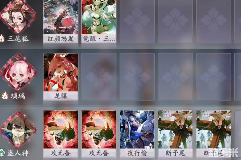 这部分的核心思路是红颜怒发转化出三尾狐的牌,盗人神财宝不消耗鬼火,让三尾狐尽量打完手牌。可以化形、璃啸吃夜行偷换成财宝。起手留牌。