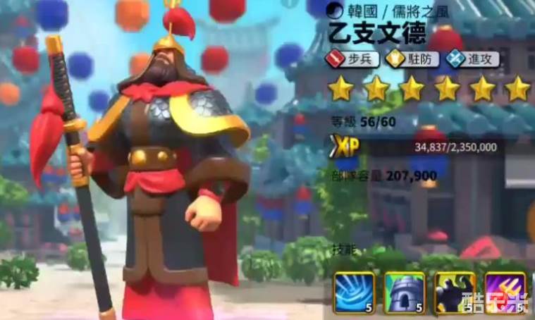 乙支文德史诗级别的步兵武将,定位是驻防与进攻,获取途径为酒馆、远征。主动技能为水淹七军,会对目标单位造成一次系数为七百五的直接伤害,并让目标敌人的防御力减少百分之三十,持续时间为两秒。该破防效果的收益比较大,因此比较建议玩家将其放在主将位置上,搭配上高爆发的副将英雄就能打出不错的伤害。被动技能为坚壁清野,当在自己的城市驻防的话,就会让部队的防御力增加百分之七。下面和酷乐米小编一起来看看吧