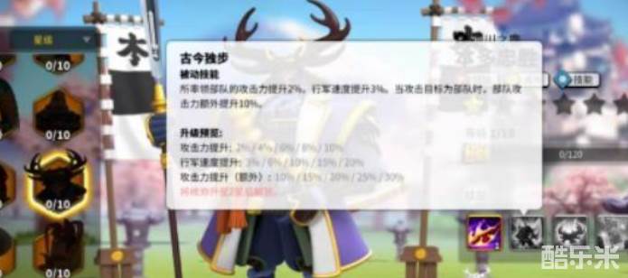 移动速度还会减少百分之二十,每隔五秒钟最多会触发一次。伤害与减速效果都不算强,实际上的用处并不大,但是有总比没有好一点。德川四天王会让部队的容量提升百分之十,当前率领部队的兵力每下降百分之八,就会让造成的技能伤害提高百分之一。而当我们携带两种以上的不同兵种时,就会让下降值变为百分之五。