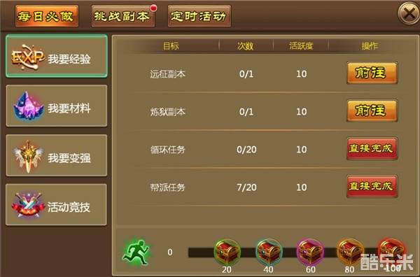 1、活跃度界面右侧列出增加活跃度的所有项目,以及可完成的次数、完成获得的活跃度。2、活跃度界面下方显示奖励,当达到活跃度条件后,手动点击【箱子图标】获得奖励。