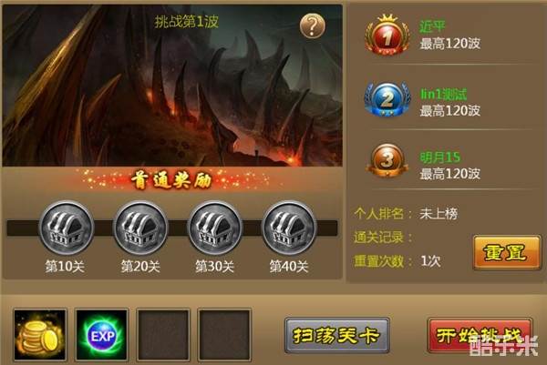 点击开始挑战进入副本,如果觉得关卡难度无法通过,还可以重置关卡数从第一关开始哦。