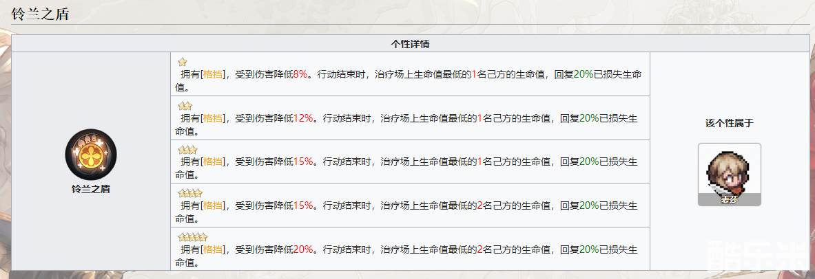 格挡与减伤:1-5星时拥有[格挡],受击伤害降低8%-20%(随星级提升),行动结束时治疗场上生命值最低的1-2名己方角色,回复其20%已损失生命值。