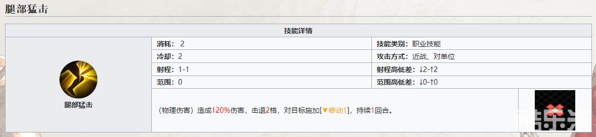 造成120%物理伤害,击退2格并降低目标1点移速,冷却2回合。前期清怪效率一般,但击退效果可联动地形杀。