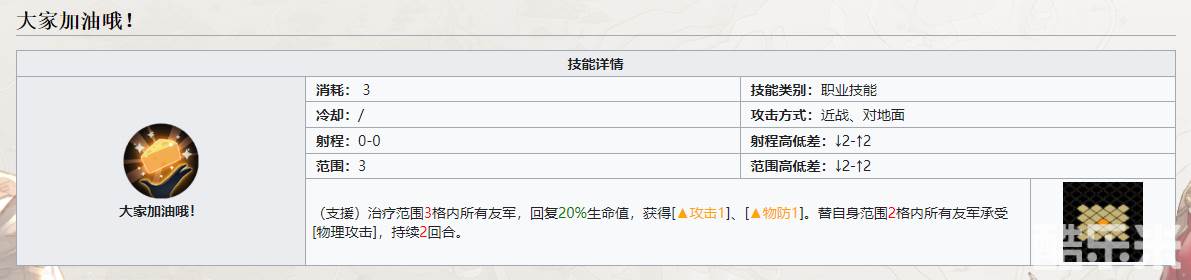 大家加油哦!:治疗3格内队友20%生命,提升自身及2格内友军1点攻防,持续2回合。群体增益+治疗,适合高压环境。