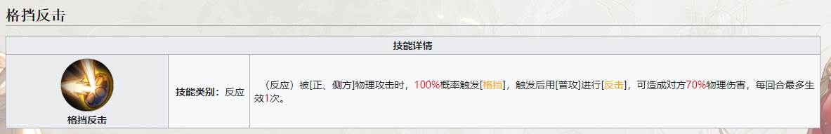 格挡反击:被正/侧近战攻击时100%格挡并反击70%伤害。攻防一体,克制高频近战阵容。
