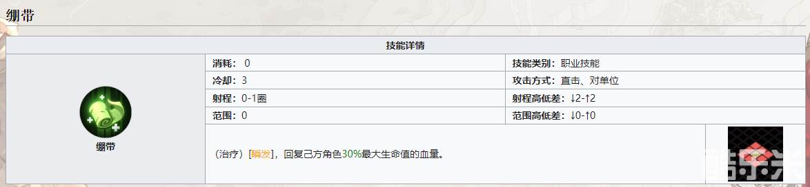 绷带:瞬发单体治疗30%生命。实用性低,通常选择其他技能。