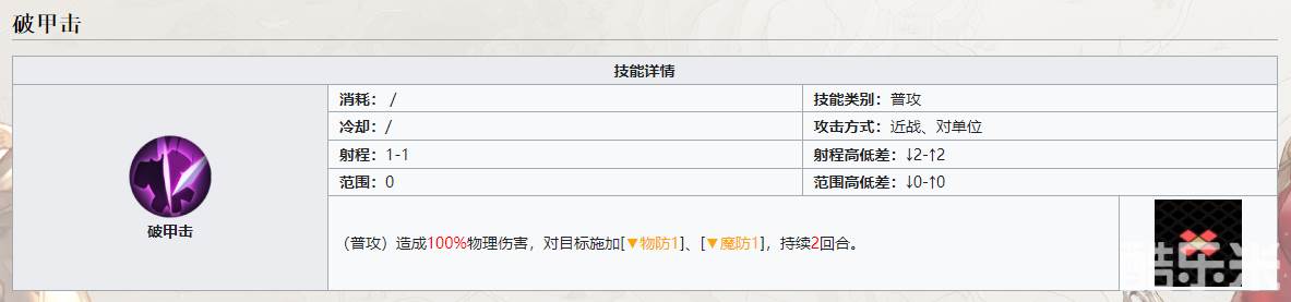 破甲击:普攻附加降双防20%的debuff,持续2回合。团队增益核心,优先级最高。