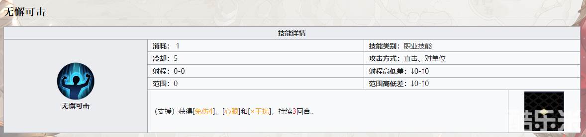 守护:替2格内友军承受物理攻击,自身防御+20%,每回合限1次。适合保护后排或吸引仇恨。