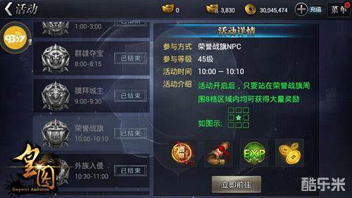 在《皇图》之中的“荣誉战旗”活动玩法开启期间,只有站在荣誉战旗周围8格区域内的勇士强者,才能够感受荣誉战旗荣光的照耀,获得大量的奖励。占据这些“有利”位置的勇士强者,每隔一定的时间,便能够随机获得包括金币、经验、荣誉积分以及贡献值等在内的一种奖励。