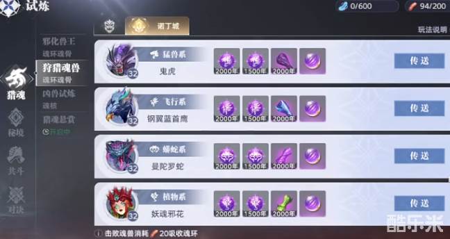 玩家如果想要获取魂环,其实操作的方法是比较简单的,选择来到诺丁城试炼即可。在这里所有的猎魂者都可以走上一条获取魂环的征程。从界面上就可以看出眼前有很多的魂兽等待着大家去挑战,玩家可以根据实际的情况选择。