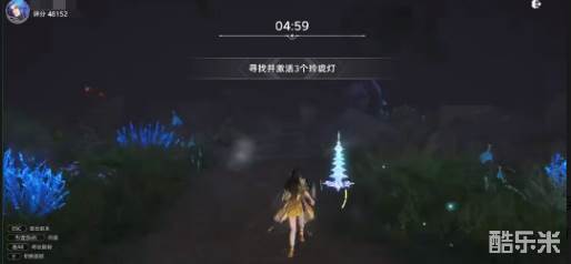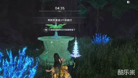 在点击试炼按钮之后,马上就接到了任务,任务其实很简单,要求玩家在5分钟的时间内找到三个玲珑灯,并且要完成激活。玩家可以操控角色,朝着小道上前行,可以看到在夜光的照射下,蓝紫色的植物也会闪烁着光芒。来到一个绿色喷泉边上,找到了第1个玲珑灯。