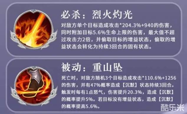 必杀技烈火灼光是非常强大的技能,它能够对敌方单个目标造成攻击204.3%+940的伤害,同时附加目标5.6%生命上限的伤害,最大值不超过攻击力2倍,并且还能偷取目标的增益状态,偷取的增益状态会转化为持续3回合的固有状态,被动技能重山坠则让华雄在死亡时也能发挥巨大的作用,它可以对敌方随机3个目标造成攻击110.6%+1256的伤害,并有47%概率造成沉默状态持续3回合。