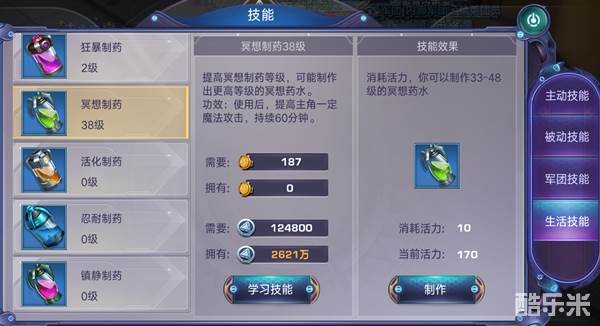 手游里面生活技能就是做药水,药水可以增加你的某个属性(魔法攻击、物理攻击、魔防、物防、生命上限),还有任务链也会需要上交~