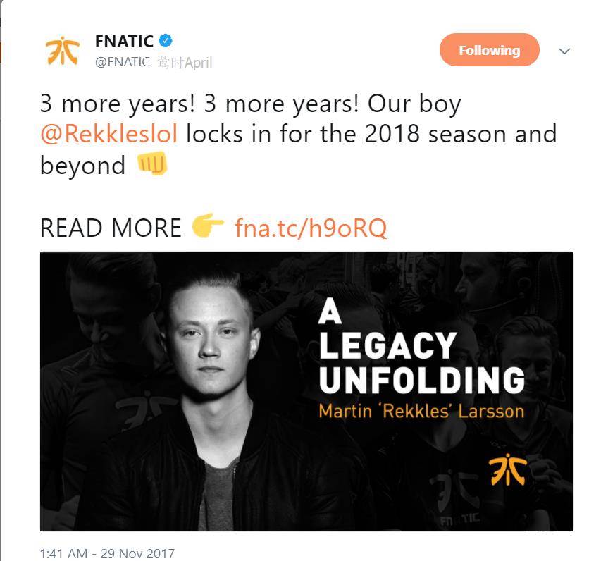 我非常高兴在这里宣布FNC Rekkles的延续”——Rekkles