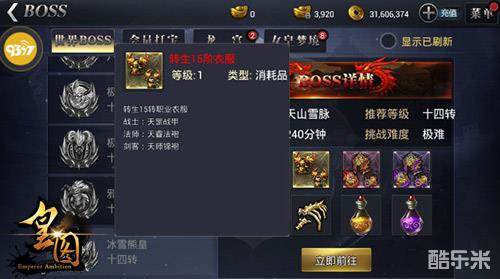 要说获取装备的捷径,自然就是打BOSS了。《皇图》此前新版本推出的新地图“天山雪脉”之中刷新的新BOSS——冰雪熊皇,被击杀之后便会有一定的几率爆出转生15、16阶的高级装备。毫无疑问,对于新BOSS“冰雪熊皇”的抢夺,战斗将会比其它BOSS要残酷许多!