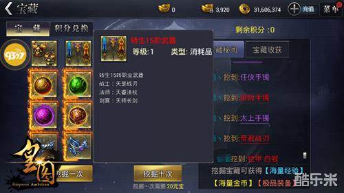 人品还是得攒,万一就爆发了呢!《皇图》新版本也对宝藏系统玩法进行了相应的调整,使得勇士强者们有机会通过挖宝直接获得转生15、16阶的稀有装备。如果不想和其它强者拼死拼活地抢一个BOSS,就可以选择挖宝这一途径,不过这可是相当拼人品和财力的。