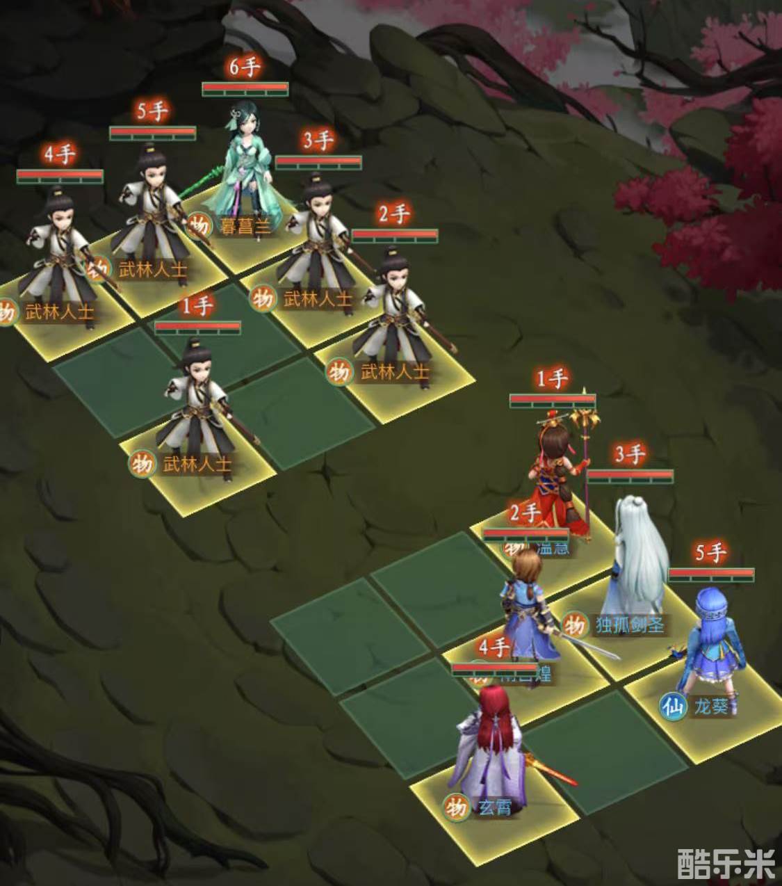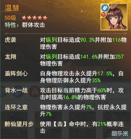 温慧放3号位,在此阵容的作用是利用普攻“虎袭”对纵列目标造成伤害,攻击命中时,有21%概率造成连击,前中期配合伙伴压低右侧武林人士精力,可让龙葵绝技打在暮菖兰身上,造成高额伤害。