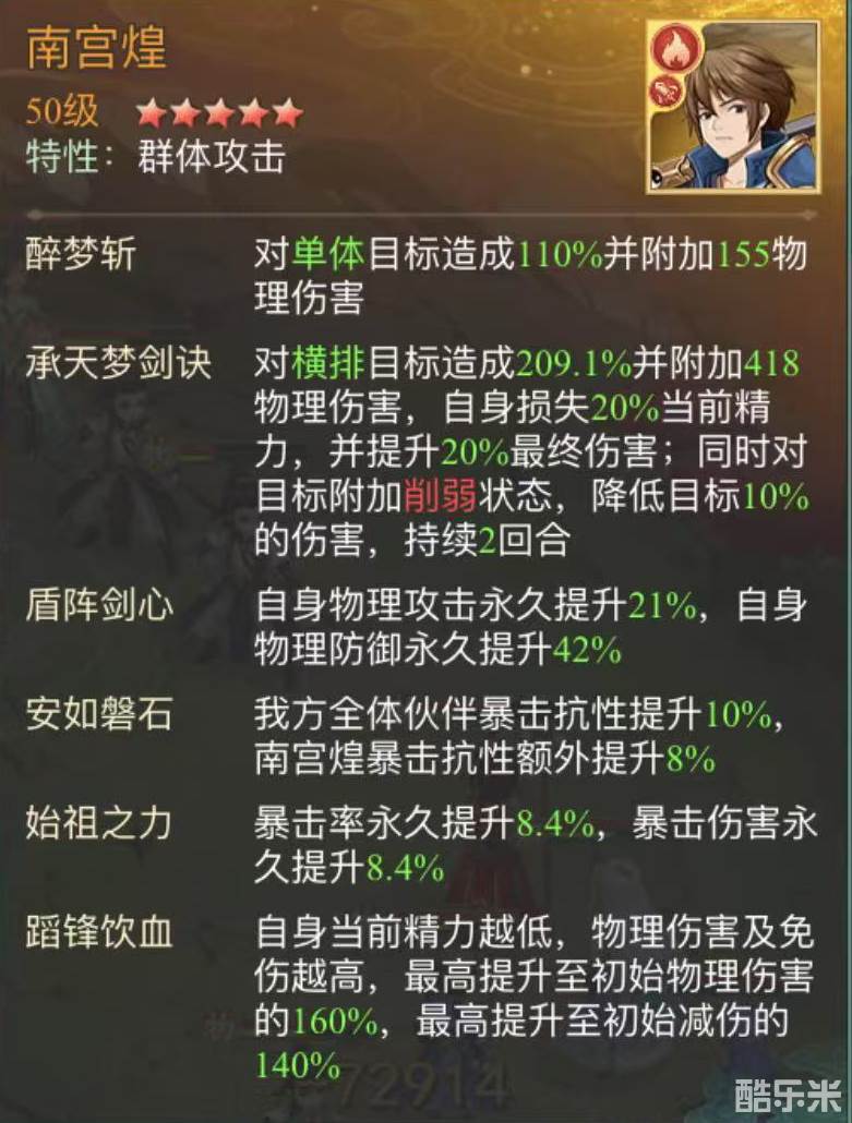 南宫煌放5号位,南宫煌绝技“承天梦剑诀”对横排目标造成伤害,并且对目标附加削弱状态,放这里可打到敌方最后一排,并降低暮菖兰的输出,有利于伙伴存活。