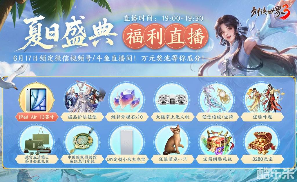 夏日福利资料片嘉年华开启,各位少侠不仅可以在游戏内参与新版本各项活动,也可以在【夏日盛典福利直播】抽取多重豪华大奖!参与游戏内日常活动,可轻松获得集字活动兑换材料,集齐后兑换好礼有机会获得直播抽奖券、护法招募券、现金红包兑换等。拥有抽奖券的少侠可参与6月17日晚7点官方直播间的活动,IPad Air M3、极品护法任选、炼彩外观材料、大疆掌上无人机、故宫联名五清雅士茶具套装、任选在售外观等绝品大礼等你抽取!