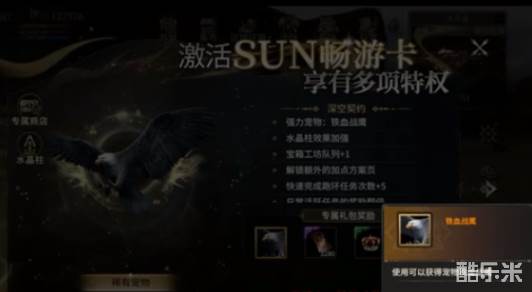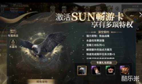 游戏中有很多的宠物,除了大熊猫之外,还有铁血战鹰。玩家如果想要获得铁血战鹰就需要选择激活SUN畅游卡,在激活之后,除了可以获得铁血战鹰,同样也可以解锁专属的商店,可以享受水晶挂文挂纹特权。还可以迅速的叠满伤害buff,冒险也可以直接开无双。