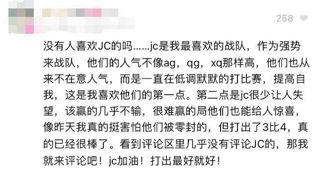 这位来自《王者荣耀助手》昵称为“云曦”的网友评论道:“没有人喜欢JC吗,JC是我最喜欢的战队,作为强势战队,他们的人气不像AG、QG、XQ那样高,他们也从不在意人气,而是一直在低调的默默打比赛,提高自我。JC也很少让人失望,该赢的几乎不输,很难赢的局他们也能给人惊喜。”