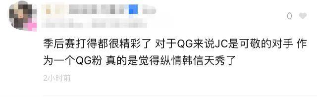 这位昵称为“陈圣俊大魔王”的网友评论道:“季后赛打得都很精彩了,对于QG来说JC是可敬的对手,作为一个QG粉,真的觉得纵情韩信天秀了。”