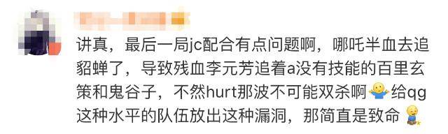 这位来自于微博昵称为“犹记一滴淡墨”的网友评论道:“最后一局JC配合有问题,哪吒半血去追貂蝉了,导致残血李元芳追着A没有技能的百里玄策和鬼谷子,不然Hurt那波不可能双杀,给QG这种水平的队伍放出这种漏洞,那简直是致命。”