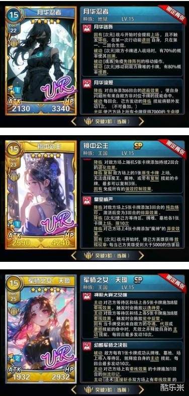 比较推荐带有“战斗开始时提前上场”和“己方发动的降临技能将额外发动一次”的卡,如满破月华忍者、神龙大侠、顶配提亚马特化身等,提高展开卡和解场卡的技能效率。比如说蜘蛛女王这种,能从解2张卡变成解4张,基本上就解光敌方半个卡组了。