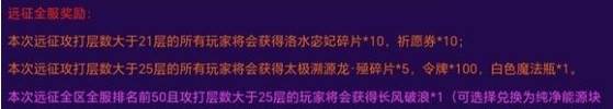 本次远征攻打层数大于21层的所有玩家将会获得洛水宓妃碎片*10,祈愿券*10;