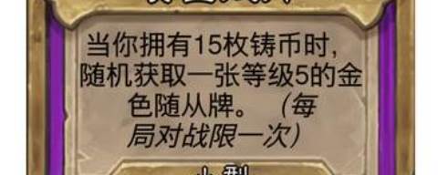 效果:当你拥有15枚铸币时,随机获取一张等级5的金色随从牌。(每局对战限一次)