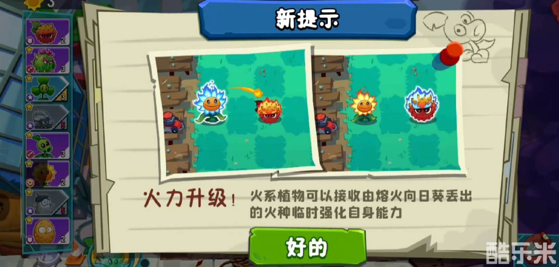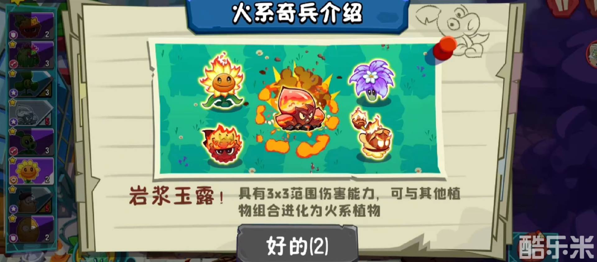 这样一来我们的思路就很清晰了,首先向日葵是必选的,因为我们需要向日葵来收集阳光,才能种植更多的植物。其次我们要选择火系植物,这里推荐岩浆玉露和熔岩荔枝,岩浆玉露不仅具备3×3的范围伤害能力,还可以和其他植物进行叠种,帮助其他植物进化为火系植物。熔岩荔枝本身就是火属性植物,可以将它们种植在前排,这样就可以完全克制住冰箱僵尸。