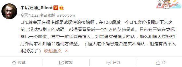关于“LPL最后一个席位”的消息,知名微博大V@午后狂睡_Silent在微博上透露目前有三家在竞标,而传闻其中一家是恒大俱乐部。