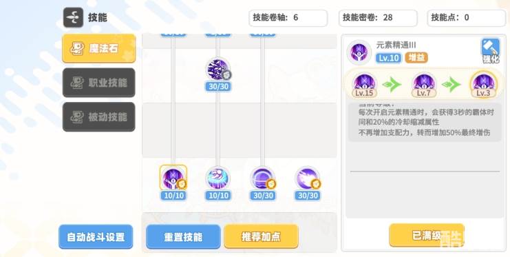 在大家前中期的游戏进程中,技能点和技能秘卷的资源相对稀缺,这个阶段并不建议玩家将技能点投入到觉醒技能之中,因为觉醒技能虽然威力强大,但在前期资源紧张的情况下,过早投入可能会影响其他关键技能的升级与发育,当角色后期等级顺利达到300级,并且技能秘卷数量大于4000时,才可以考虑觉醒技能的加点,对于元素之灵来说元素精通技能无疑是整个技能体系中的关键所在。
