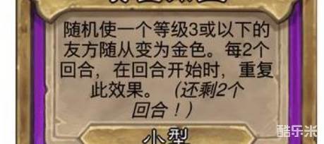 效果:随机使一个等级3或以下的友方随从变为金色。每2个回合,在回合开始时,重复此效果。