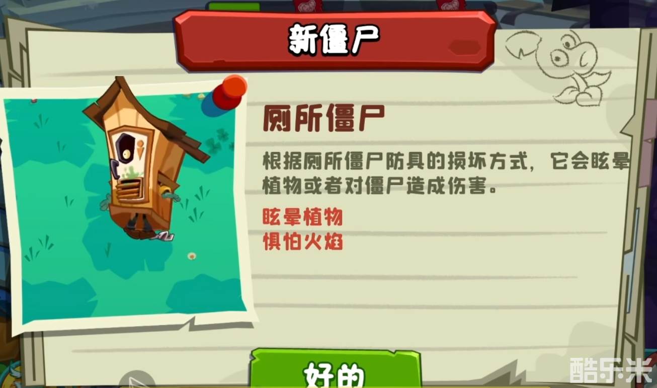 厕所僵尸是游戏中新加入的一种僵尸,其初始状态下会扛着一个木质的厕所,打破后就会变成正常的普通僵尸。但要注意,在打破厕所时,要是用全程都用的是非火焰类的植物,那在测试爆开时,僵尸会扔出道具,眩晕它所在的直线上的僵尸,且眩晕期间所有植物都无法攻击,特殊能力也不会起效。