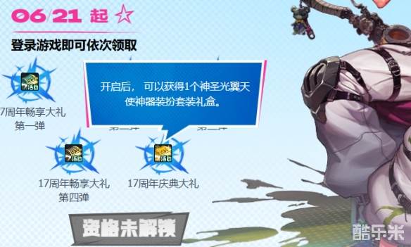3、玩家最快可以在6月29日领取完前面4弹奖励后,直接领取最后的17周年庆典大礼,其中就是“神圣光翼天使神器装扮套装礼盒”。