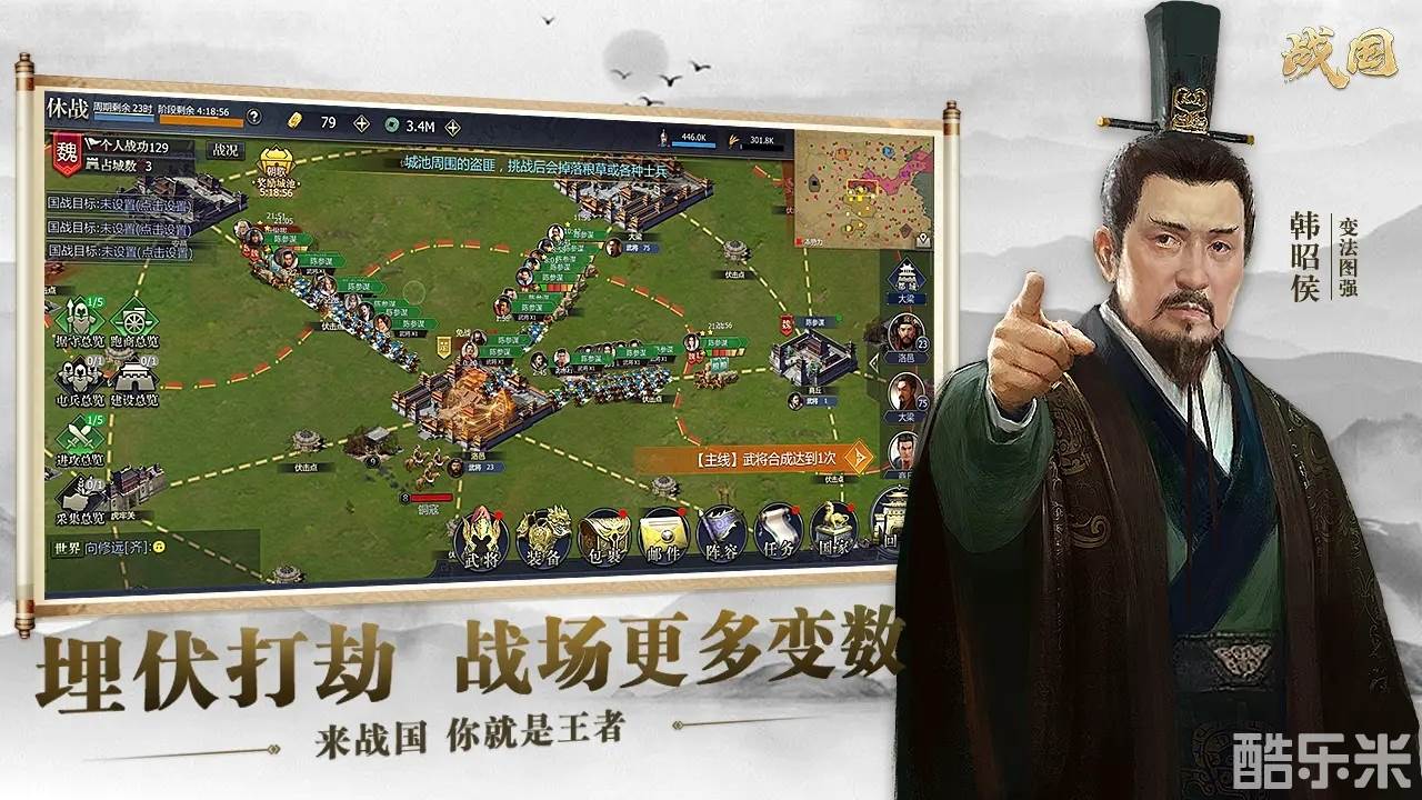 《战国》是由北京瑞游联动匠心制作的一款SLG国战策略手游。还原真实的古代战争细节,突破战报式策略游戏的桎梏,以策略为核心,探索全新的国战模式,下面和酷乐米小编一起来看看吧