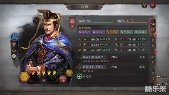 曹丕,稀有度为S级,拥有较高的政治成长属性。自带战法名为戮力上国,效果是让城建设施的升级时间降低百分之三十。