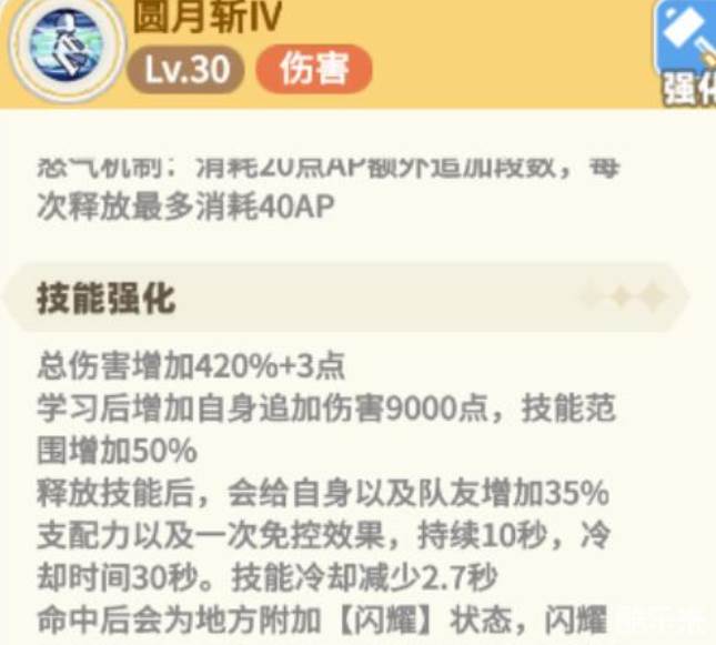 在前期技能书不够的情况下,主要的输出技能是【圆月斩】,技能点满之后可以无限转圈,打伤害和挂机体验都非常好。无论技能书多还是少,圆月斩都应该优先点满15-10-3。圆月斩的命中三层时能触发1000%的攻击力伤害,配合盾牌充能技能触发支配状态时,伤害非常高。