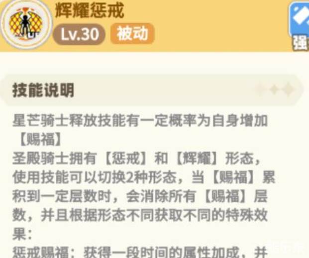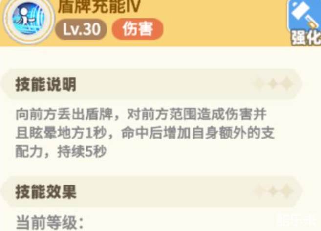 核心的BUFF技能是【盾牌充能】,前期如果书不够,可以不强化,放在第一位使用即可,可以提升大量支配力,持续5秒,这也是锤盾前期主要的伤害来源。另外,【辉耀惩戒】(惩戒形态)也是前期的重要BUFF技能。