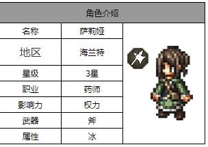 《大陆的霸者》游戏中有着许多的特殊角色,其中萨莉娅是一个三星的辅助角色,使用技能可以对敌人造成伤害并恢复友军生命值,提高友军的抗性,下面和酷乐米小编一起来看看萨莉娅这个角色的具体信息吧。