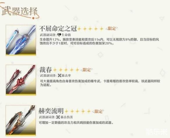1、卡提希娅的武器首选专武不屈命定之冠,如果没有抽到的话,也可以使用椿的专武裁春或者长离的专武赫奕流明替代。