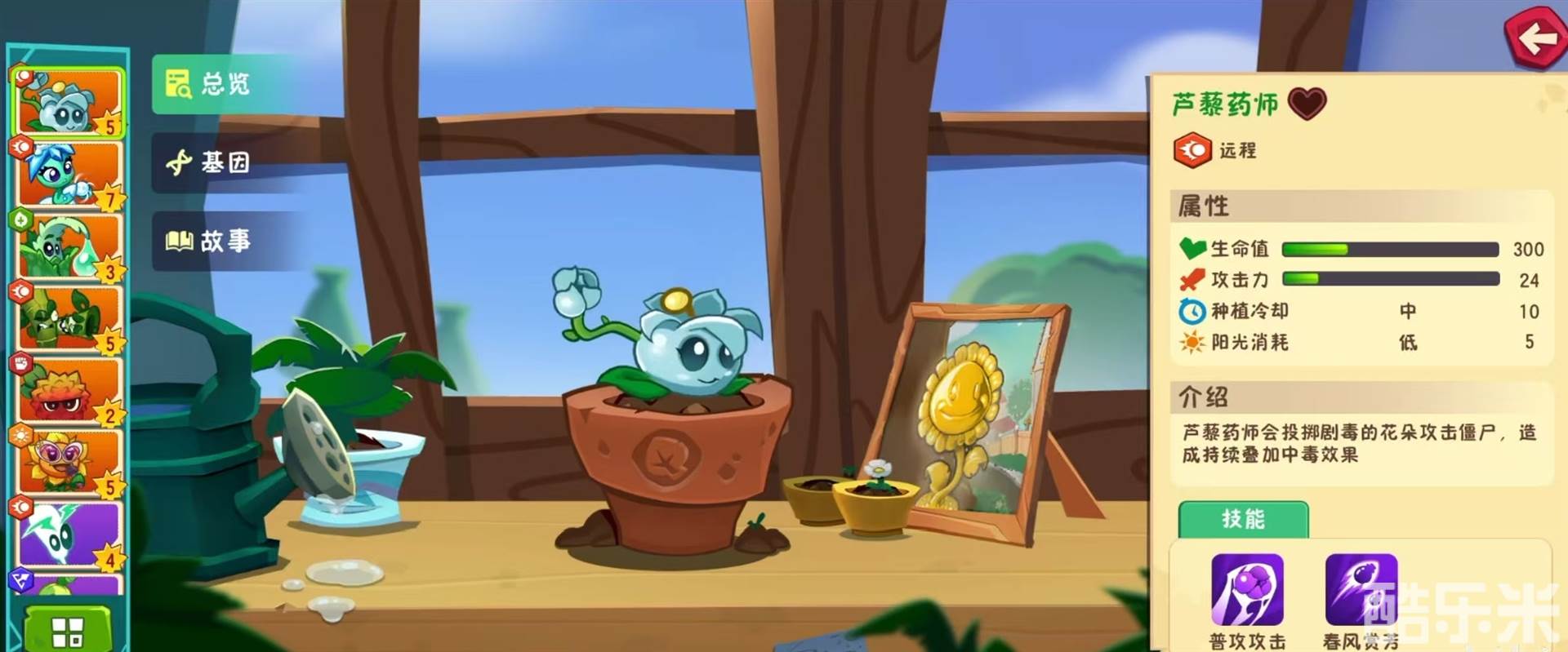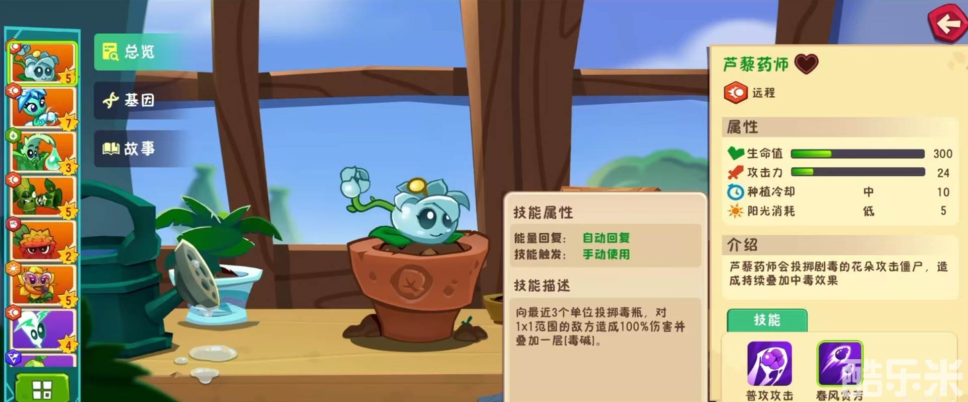 芦藜药师是属于远程输出类型,自身的生命值300,点攻击力24,种植冷却中等,阳光消耗低,只需要5点阳光就可以种植下去。芦藜药师可以投掷剧毒的花朵去攻击僵尸,造成持续叠加中毒效果,他的攻击技能有两个,分别是普通攻击和春风赏芳。