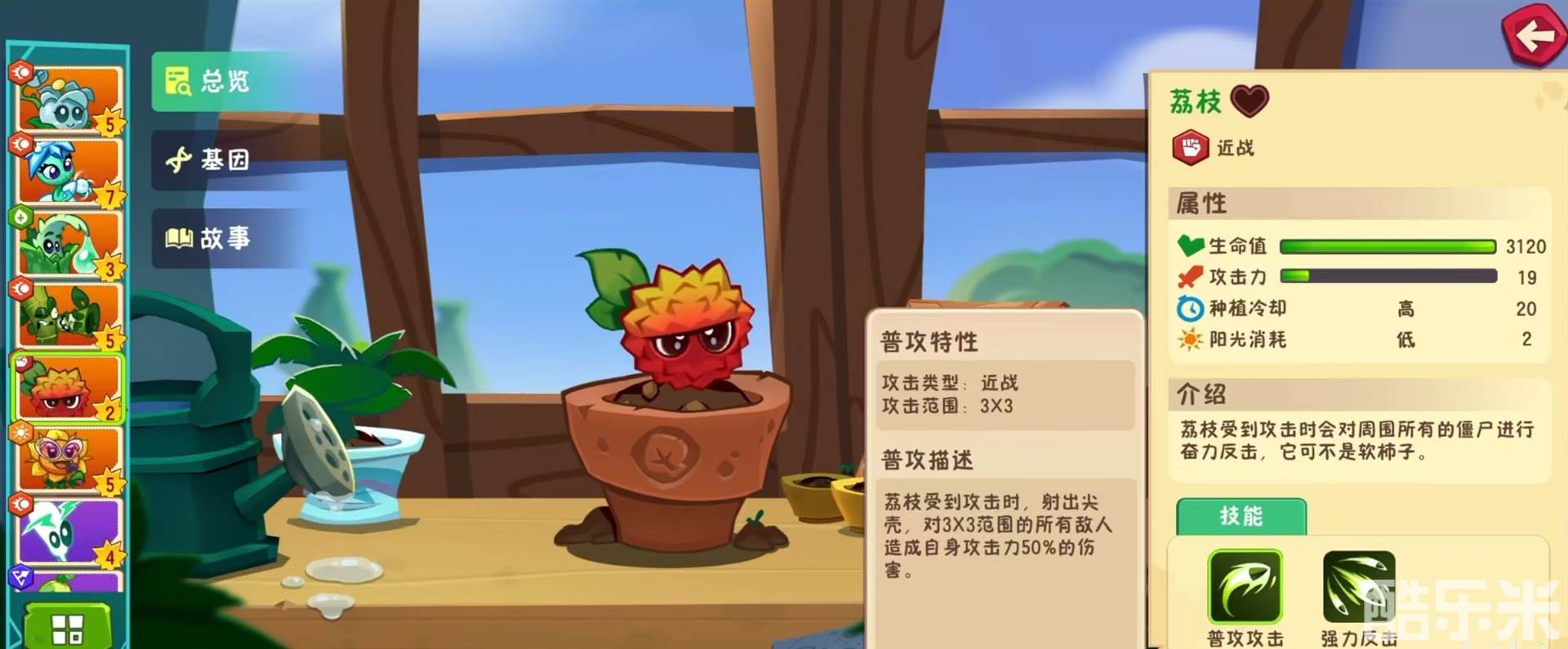 玩家在通关城区第1关之后就可以直接获得荔枝,所以一开始就能够直接使用,它需要消耗少量阳光种植。在基础属性方面,生命值可以达到3120,所以血量非常厚,这样就有了更多战术方面的应用,攻击力为19点,种植冷却比较高,阳光消耗只需要2点。当大家将荔枝种下去之后,只要受到攻击,就会对周围所有的僵尸进行蓄力反击。