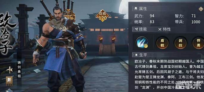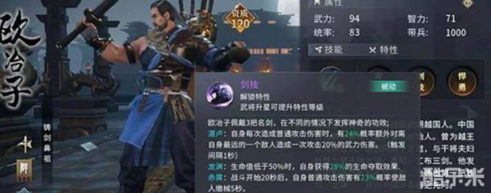 七雄纷争中欧冶子是资质120的橙色武将,游戏里的定位是拥有强大全场输出能力的战士步将。游戏中他的人物建模身后就背着五把自己铸造的名剑,同时他的特性剑技也和这些剑有着密切关系。解锁此特性的欧冶子将会佩戴三把自己铸造的名剑,分别是湛卢,龙渊,赤霄,每把剑都对应着不同的战斗属性。湛卢是给欧冶子增加武力伤害,龙渊是当欧冶子生命值过低时给予他生命夺取效果,而赤霄则是在战斗中有几率让敌人缴械,这三把剑使得欧冶子兼具输出、防护、战术三种能力,所以是非常值得培养的后期武将。下面和酷乐米小编一起来看看吧